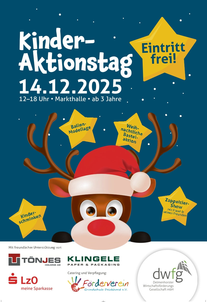 Wie jedes Jahr in der Adventszeit öffnen sich die Tore der Delmenhorster Markhalle für den Kinderaktionstag. Organisiert von der Delmenhorster Wirtschaftsförderungsgesellschaft mbH (dwfg), sorgt die Veranstaltung dafür, dass Kinder unvergessliche Weihnachtsmomente erleben und mit einem Lächeln nach Hause gehen.